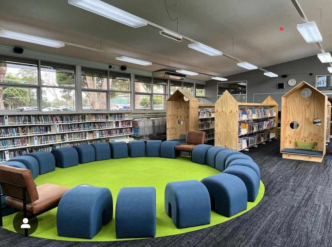 Our team recently partnered with Christ Church Grammar School to transform their library into a vibrant and multifunctional learning space. The project included a wide scope of custom features: a large upholstered story mat, a 7-metre banquette with scatter cushions, ottomans, a dedicated reading chair, new carpet, bespoke cabinetry, a striking “hero” book wall, chess tables, a LEGO wall with custom storage, and more.